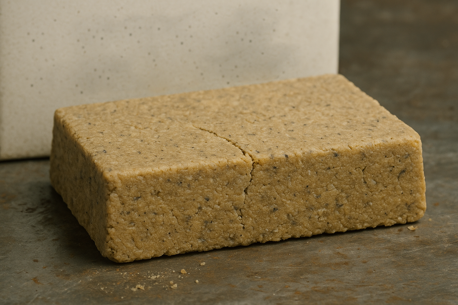 Consistency: Dense, pliable mass with a slight oily surface sheen. Rehydrated powder forms a gelatinous slab similar to firm tofu or soft clay.